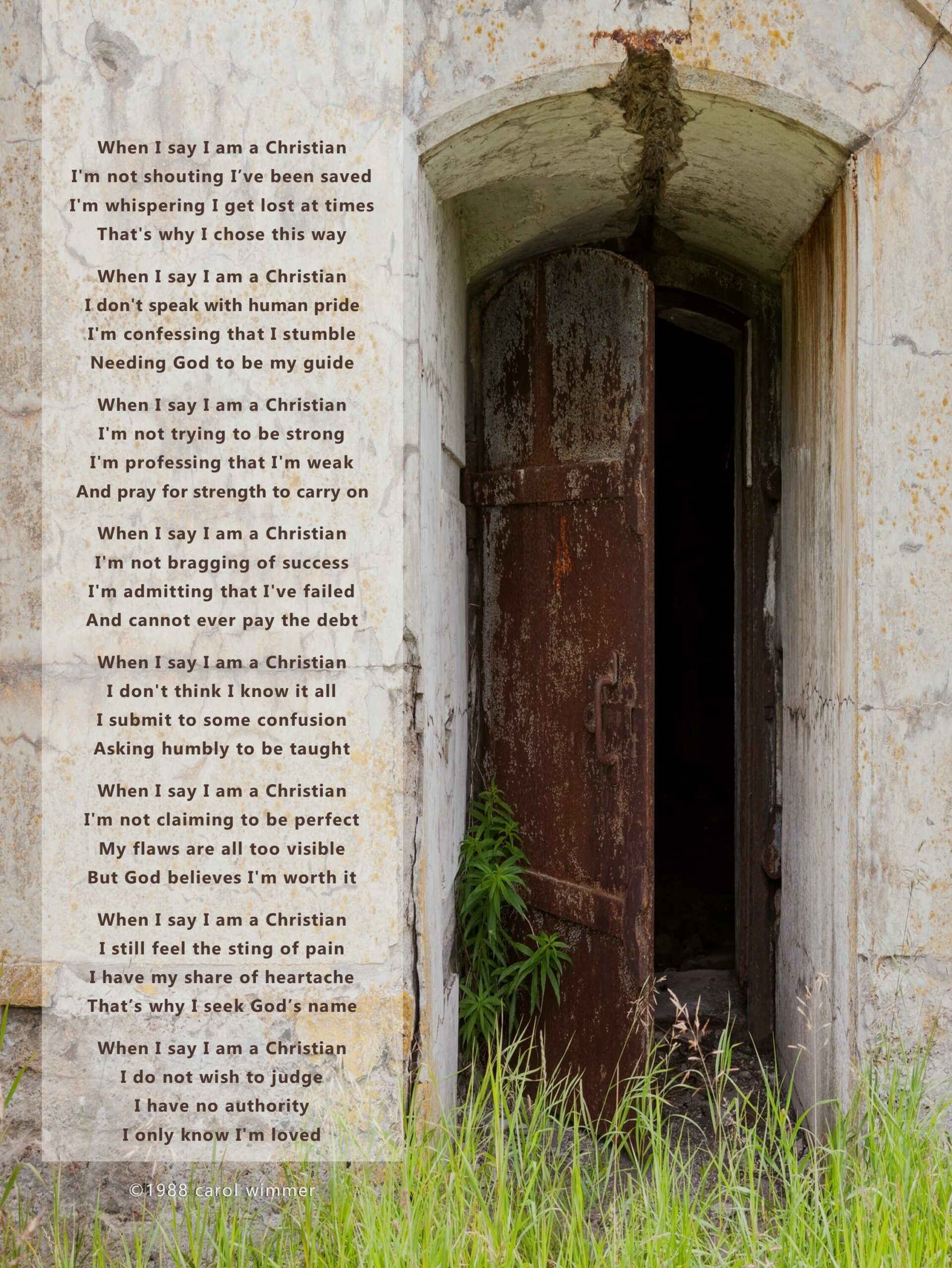Thank you for visiting the official home of the poem, When I say I am a Christian. This page exists to provide information about the poem’s history and its original inspiration. For permission to copy, publish or print, please contact the author at https://carolwimmer.com/contact/